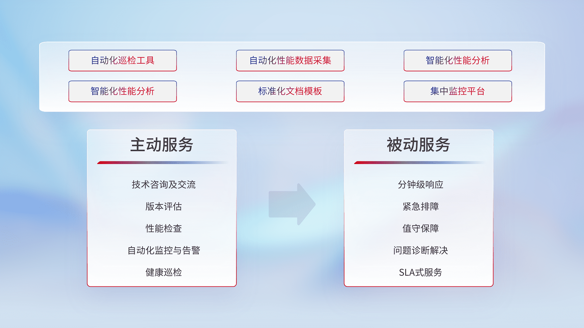 智能化工具和标准化文档,,保障服务质量,,,提供主动服务(包含技术咨询、、、、版本评估、、性能检查、、、自动化监控与告警、、、、健康巡检)和被动服务包含(分钟级响应、、、紧急排障、、、值守保障、、问题诊断解决、、、、SLA服务)。。。